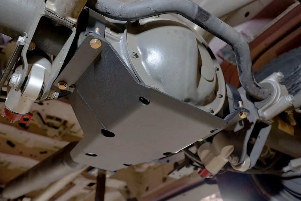 Constructed from ¼-inch thick steel and finished in a durable black powder coat, the skid plate provides a strong, smooth surface that glides over obstacles while resisting rust and corrosion. It offers full coverage for the driveshaft U-joints, differential center section, and lower portion of the differential cover, preventing costly leaks and failures.