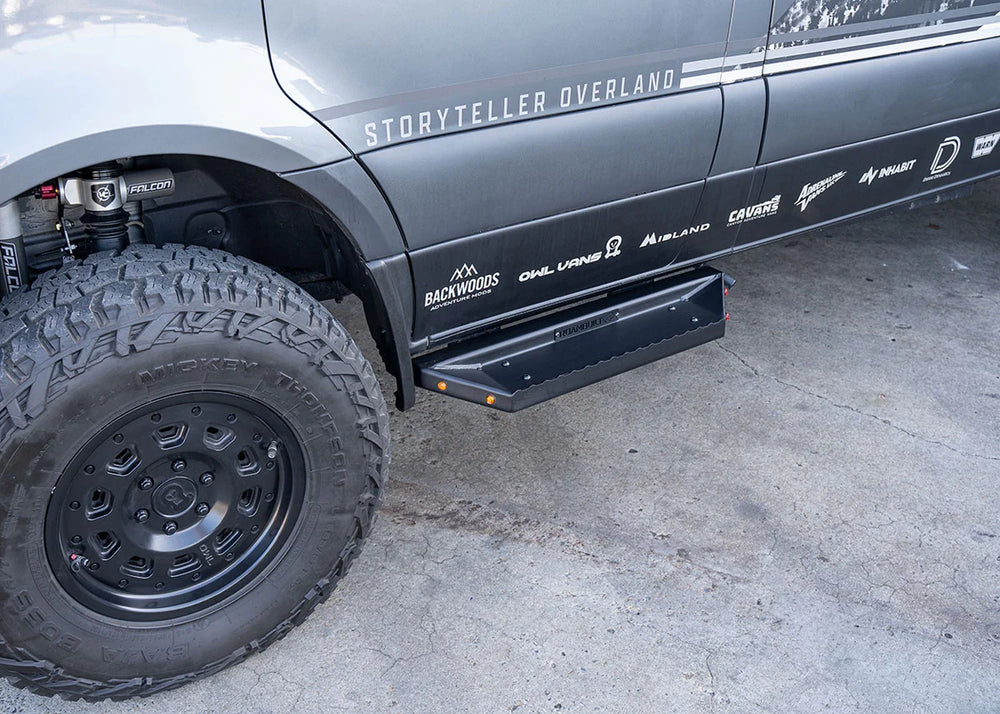 Upgrade your Mercedes Sprinter or Ford Transit with PAD Overland’s Short/Flat Side Steps—engineered for everyday comfort and off-road durability. Crafted from lightweight, rust-proof aluminum with a rugged black textured powder coat, these steps deliver stable, secure footing while complementing your van’s clean exterior lines.